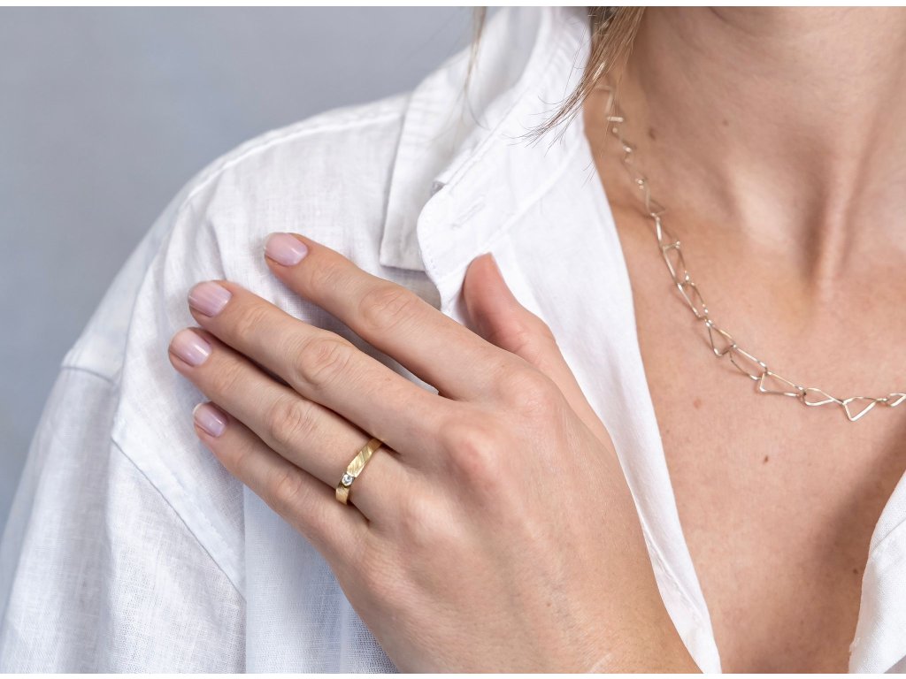 Máme variantu bílé nebo žluté zlato. Zlato 585/1000 a diamant. Na objednání může být i z růžového zlata. Vzhledem k tomu, že všechny prsteny vyrábím ručně, může se prsten nepatrně odlišovat, což zaručí to, že každý prsten je originál.